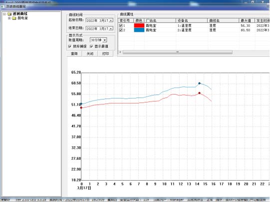 在曲線查詢界面,可以直接查看遙測參量曲線,包括溫度、濕度、水位、有害氣體、電壓、電流等曲線。