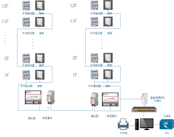 站控管理層:設有高性能工業計算機、顯示器、UPS電源、打印機等設備。監控系統安裝在計算機上,集中采集顯示現場設備運行狀況,以人機交互的形式顯示給用戶。 以上開關模塊均采用KNX總線傳輸,一般都采用4根連線,接線簡單方便,傳輸距離可達1.2km。