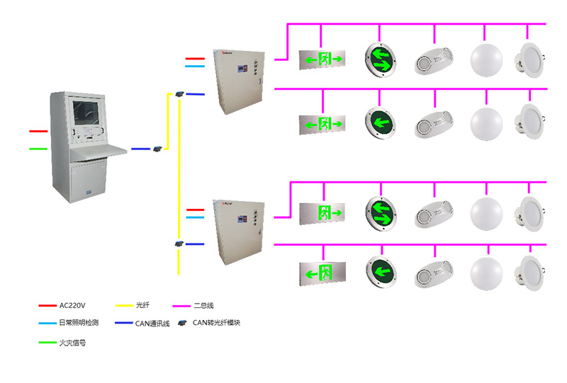 消防應(yīng)急照明與疏散指示系統(tǒng)由控制器(主機)、集中電源和燈具(疏散指示燈具、應(yīng)急照明燈具)等幾部分組成。