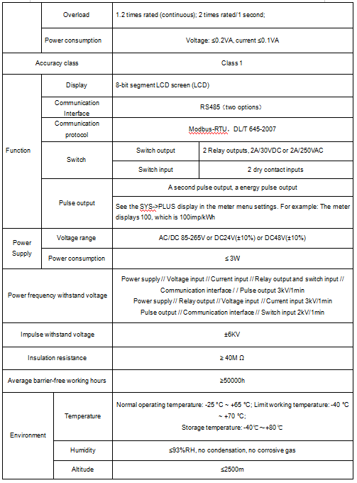 The meter can have infrared communication interface and RS-485 communication interface, and supports Modbus-RTU protocol and DLT645-97 (07) protocol at the same time.The meter can have relay alarm output and digital input function;You can set the ratio, alarm, and communication through the meter panel keys according to different requirements.The meter can have event recording of switch (Modbus protocol), programming and event setting records (645 protocol), instantaneous and timing freeze function of data (645 protocol), value recording function of voltage and current power.